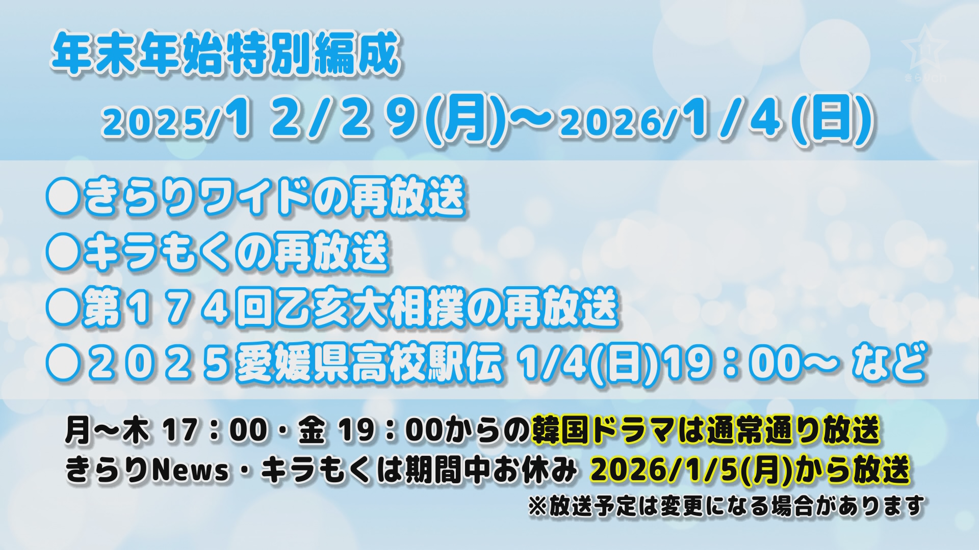 1月12日は「成人の日」です。午後7時からのきらりワイドでは、「令和8年西予市二十歳のつどい」を放送予定です!二十歳を迎えたみなさんの晴れ姿をぜひご覧ください☆